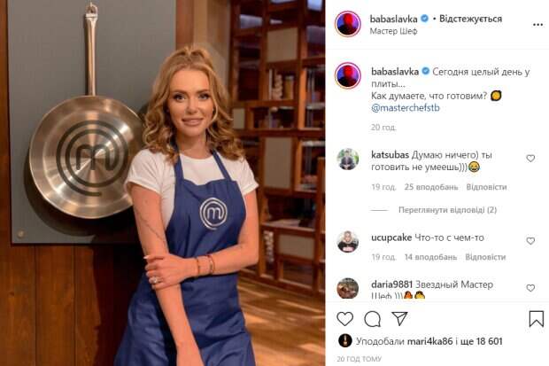 Рядом на стене висит сковородка с логотипом "Мастер Шеф", такой же логотип у Славы на фартуке. Звезда одета в обычную белую футболку и фартук. Но ее макияж и прическа - безупречны. Легкие локоны слегка подобраны на макушке и нюдовый макияж первратили Славу в настоящую красотку. "Сегодня целый день у плиты… Как думаете, что готовим?