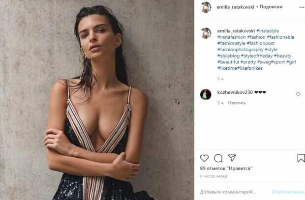 Модель стояла у серой невзрачной стены. Ее прическа - мокрая укладка, смотрелась очень эффектно. Платье держалось на тончайших бретельках, которые едва не съезжали с плеч, что придавало образу особой пикантности. Блестящее платье со смелым декольте сидело на знаменитости прекрасно. А то, что она не надела белья, позволяло бюсту искусительно выглянуть из-под ткани. За пять часов пост собрал почти 100 лайков и пока ни одного комментария, хотя она выглядит на все 100. Ранее мы писали, что Эмили Ратаковски предстала в персиковом платье с длинным декольте, в котором искусительно смотрелась грудь. Пышные формы, находились под тканью, но пикантности все-таки прибавлял факт, что они были без белья. Ткань струилась на теле и натянулась на больших прелестях. Ранее сообщалось, что Эмили Ратаковски предстала в откровенном купальнике с полностью открытой спиной, особо подчеркивающим выпуклую "пятую точку" звезды и ее соблазнительную грудь. На голове у звезды завернуто полотенце, из чего можно сделать вывод, что модели недавно из душа. Напомним, Эмили Ратаковски выбрала яркий соблазнительный наряд – длинное платье темно-красного оттенка. Платье весьма необычного кроя пошито таким образом, что легко подчеркнул все достоинства. Напомним, беременная Ратаковски из Victoria’s Secret посветила округлившейся гордостью в бикини. Также Politeka писала, что Эмили Ратаковски показала в черном мини-бикини, как прячет животик. Как Politeka сообщала, что беременная Ратаковски без одежды прикрыла бюст цветочком.