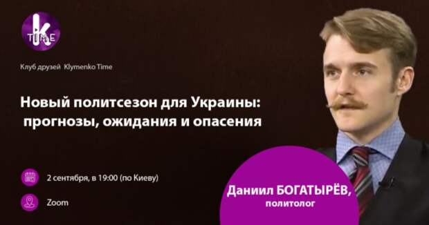 Сегодня, 2 сентября, состоится очередная встреча Клуба друзей Klymenko Time. У нас в гостях политолог Даниил Богатырев. Тема: Новый политсезон для Украины: прогнозы, ожидания и опасения Когда: 2 сентября, в 19:00 (по Киеву) Где: Zoom (зарегистрироваться на встречу) О чем будем говорить: И о внешней, и о внутренней политике!