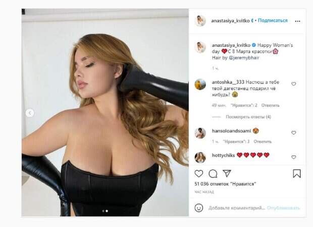 Об этом пишет Politeka.net со ссылкой на страничку знаменитости. "С 8 марта, красотки. Счастливого Женского дня", - написала Квитко. Фанаты поставили более 50 тысяч лайков и написали комментарии: "Настюш, а тебе твой дагестанец подарил чё нибудь?", "Ты такая невероятно милая, такая великолепная, с международным женским днем", "С женским днем всех женщин", "Ты самая красивая девушка в мире", "Невероятно божественная красота", "Ты красивая женщина", "С женским днем красивая малышка", "Невероятно сладкая". Мы писали, что модель белья и купальников Анастасия Квитко показала дерзкий образ в черном. В этот раз Анастасия решила надеть черный боди без принтов и украшений, а также дополнила наряд лаковыми ботфортами и таким же черным лаковым плащом, который намеренно распахнула. Напомним, русская Кардашьян взволновала видом своих "сокровищ" в полупрозрачном боди А еще Politeka писала, что русская Кардашьян показала роскошные "персики" в экстремально-узком платье Также Politeka сообщала, что пышногрудая русская Кардашьян лишила дара речи, показывая бюст в невероятном декольте