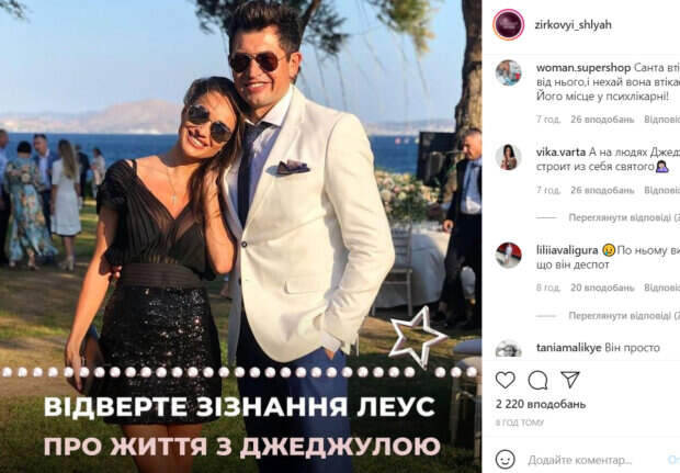 По словам Леус, впервые Джеджула поднял на нее руку через два месяца после свадьбы. Дальше ситуация только ухудшалась. «На 8 месяце беременности он бросал меня на пол и все снимал на камеру. Плевал в лицо и снимал...», - отметила Леус. Она также рассказала, что Джеджула подсыпал ей в кофе наркотики, после чего наблюдал, как она занимается на беговой дорожке. В комментариях рассказ женщины вызвал большой отклик. «Очень жаль, что это не редкость в наше время», «А на людях Джеджула строит из себя святого», «Так и задумываешься... Что лучше быть одной, чем портить себе жизнь и нервную систему», «По нему видно, что он деспот», «Санта сбежала от него, и пусть она убегает! Его место в психушке!», - пишут пользователи сети. Напомним, что жена Джеджулы после скандалов с мужем поразила признанием: "Я физически не смогу...". Как сообщала Politeka, Андрей Джеджула показал, как отдыхает после публичных скандалов с женой: "Лучший пример…". Также Politeka писала, что жена Джеджулы показала пятимесячную дочку: "Маленькая копия".