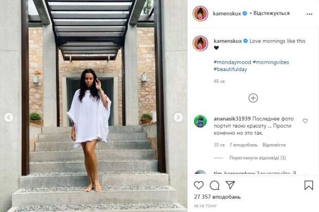 Образ дополняет белый маникюр и «влажная» укладка волос. Каменских хвастается фигурой в разных позах. Она стоит, глядя вниз, сидит, закинув ногу на ногу. Но особо пикантным оказался кадр, где артистка сидит, широко расставив ноги. Однако в Сети такую позу не оценили. Поклонники считают, что такими вызывающими кадрами артистка только портит свою красоту. «Вот обязательно нужно было на последнем фото ноги расставить. Ну что ж такое то», «Последнее фото портит твою красоту ... Прости конечно но это так», «Ноги шире», - пишут в комментариях. В то же время другие сыплют комплиментами и восхищаются любимой артисткой. «Утро начинается с чашки кофе, и аромата осеннего утра вау... Настя ты прекрасно