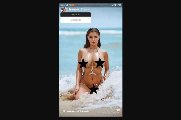 Так, звезда опубликовала стори, в котором предстала в крохотном бикини. Последнее было с прозрачными вставками, что придавало образу еще большей пикантности. Красивые бусинки на лифчике эффектно смотрелись на пышной груди. Маленький сияющий поясок на талии подчеркнул ее стройность. Красотка присела на берег в воду, в результате ее ударило волной, и прикрылись маленькие плавки на тонких лямках, а сама она была будто "влажная кошечка". Фото получилось очень ярким и горячим. Фигура звезды, ее бюст и пышные бедра - просто завораживали. Пост не собрал много лайков и комментариев в открытом доступе, ведь в сторис нет такой возможности. Ранее мы писали, что Деми Роуз сверкнула своим пышным совершенством в белом наряде, который выглядел на ней просто невообразимо. Звезда сидела на пушистом коврике, выставив в камеру упругие ягодицы. Стоит отметить, что недавно красотка стала автором линии одежды, которую демонстрирует на себе. Ранее сообщалось, что Деми Роуз позировала, умостившись на диване и до предела распахнув халат. Благодаря этому поклонники могли рассмотреть кружевное белье красотки. «Санта, в этом году я в хорошем списке», - коротко говорится в подписи. За час пост собрал более 70 тысяч лайков. Напомним, раскованная Деми Роуз в расстегнутом платье забыла прикрыть бюст: "Сладкие вишни". Как сообщала Politeka, Деми Роуз впечатлила роскошными "дынями" в лифчике с прозрачными лямками: "Утренняя звезда". Также Politeka писала, что разгоряченная Деми Роуз приковала взгляды к упругому "орешку" в леопардовом корсете