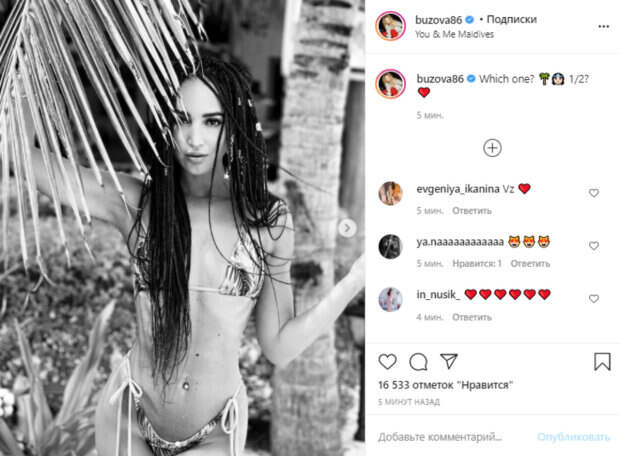 Звезда телепроекта "Дом-2" и певица Ольга Бузова вызвала недоумение откровенными снимками на тропическом пляже Как передает Politeka.net, 34-летняя знаменитость опубликовала свежие кадры в своем микроблоге в Инстаграм, на которых предстала на отдыхе на Мальдивах. Резко похудевшая Ольга, с дерзкими афрокосичкам, "выглянула" из-под пальмы, будучи в соблазнительном голубом бикини.