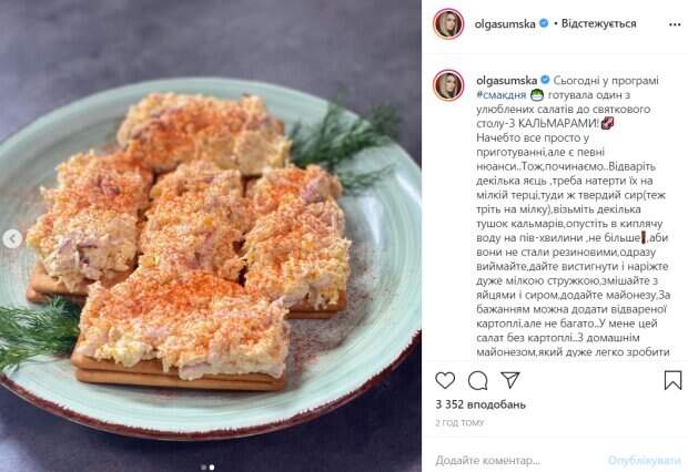 Сначала необходимо отварить яйца и натереть их на мелкой терке. Также потребуется натереть сыр. Несколько тушек кальмара нужно опустить в кипящую воду на полминуты. Этого достаточно для того, чтобы кальмар приготовился и не затвердел. Кальмару нужно дать остыть, после чего нарезать его мелкой стружкой. Все это нужно смешать с яйцами, сыром и заправить майонезом. При желании в салат можно добавить отварной картошки. Для вкуса не забудьте добавить чеснок, соль и перец. За короткое время пост с рецептом собрал более трех тысяч лайков. В комментариях актрисе оставили массу комплиментов. «Благодарю за вкусную идею», «Ням-ням», «Умничка и красавица», «Как аппетитно выглядит», «Вкусняшка», - пишут пользователи сети. Ранее мы писали, что Сумская поделилась рецептом настойки из каштанов. Их она заливала водкой или самогоном, после чего отправляла храниться в темное место минимум на две недели. Напомним, что Ольга Сумская впервые рассказала о пережитой трагедии, связанной с ребенком: "Я потеряла...". А еще Politeka писала, что растрепанная Ольга Сумская в коже взбудоражила образом из "Мастера и Маргариты": "Покраснела и...". Также Politeka сообщала, что 54-летняя Ольга Сумская в вышиванке впечатлила внешностью на съемках: "Пусть все украинские женщины. ..".