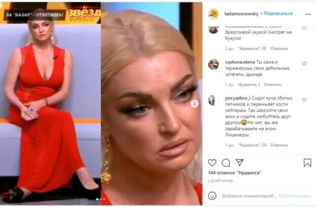 Причем слишком обтягивающая ткань подчеркнула и лишний вес артистки, и обвисший бюст, открытый неудачным образом. Вечерний макияж с блестками и отсутствие колготок озадачило пользователей сети, ведь неопрятный вид не соответствовал погоде – даже в помещении все были довольно скромно одеты, тогда как балерина перестаралась с «эпатажем». В шоу Волочкова постоянно говорила о зависти хейтеров и о том, как много людей злословят, ведь она слишком талантливая. На анти-фанатских группах не смогли пройти мимо пользователи: «Мда... Не думала, что Слуцкая такого мнения о шпагатах. Часть профессии - не значит, что этим местом светить можно почти без трусов; Почему требуют восторгов от пошлости? Может быть долой из публичного пространства бездарную пошлость и самодеятельность?; У Волочковой крайне мало красивых фото!!! Сплошная реклама- возьмите меняяя