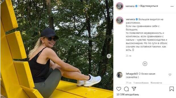 38-летняя украинская певица Вера Брежнева показала, как выглядит без макияжа Как передает Politeka.net, звезда опубликовала свежие фото в своем микроблоге в Инстаграм (чтобы посмотреть ролик, проскролльте вниз). На снимках Брежнева сидит на огромной желтой скамейке. На ней надета черная майка, кепка и кроссовки.