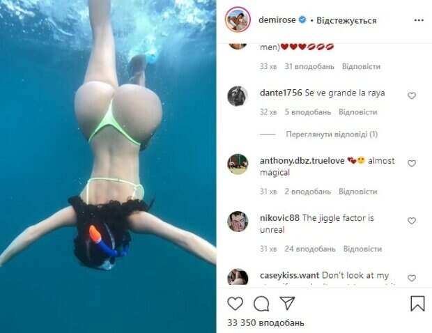 При этом на лице у Роуз можно заметить специальную маску для плаванья. «Ты действительно безупречно выглядишь», «невероятная красотка», «ах, до чего же ты круто плаваешь, Деми», «ты и есть самая магическая красотка под водой», «ты просто фантастическая», - пишут ее поклонники. До этого мы рассказывали, что модель купальников и нижнего белья Деми Роуз, которую называют "британской Кардашьян", показала смелый образ в одних белых перчатка. Модель является довольно востребованной манекенщицей для многих брендов белья. Поэтому в социальной сети Инстаграм девушка довольно часто показывает смелые кадры с фотосессий, на которым позирует практически без одежды. Нередко Деми показывает себя и вовсе без белья, чтобы обратить на себя больше внимания фанатов. Напомним, мокрая Деми Роуз показала идеальный "орешек" в белоснежном бикини. Как сообщала Politeka, Деми Роуз не смогла удержать "черешенки" в красном бикини с вырезом. Также Politeka писала, что Деми Роуз покорила размерами своих прелестей, забыв о лифчике