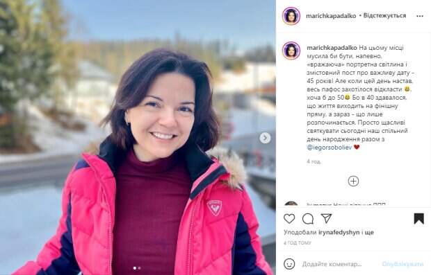 Как оказалось, Маричке исполнилось уже 45 лет, но возраст ее совершенно не беспокоит. На новых фотографиях, которые телеведущая показала в соцсети, можно увидеть, она вместе с мужем Егором Соболевым отправилась в горы, где активно провела свой праздник, встав на лыжи. В подписи к фотографии Падалко написала: "На этом месте должна была бы быть, наверное, "впечатляющая" портретная фотография и содержательный пост о важной дате – 45 лет!". А также добавила, что когда этот день наступил, то весь пафос захотелось отложить. "В 40 казалось, что жизнь выходит на финишную прямую, а сейчас – лишь начинается", - отметила Маричка и рассказала, что в этот день свой праздник отмечает не только она, но и ее муж, так что решили провести его вместе. Поклонники в восторге от новых фотографий телезвезды, ее и мужа поздравляют с днем рождения, оставляя много теплых слов и поздравлений. Напомним, Звезда "1+1" Маричка Падалко похвасталась неожиданным талантом, видео с отдыха: "Впервые за полтора года..." Как сообщала Politeka, Звезда "1+1" Маричка Падалко удивила выходкой на морозе: "Невозможно открыть...". Также Politeka писала, Маричка Падалко после череды трагедий с детьми обратилась к украинцам: "По версии полиции, к этому. ..".
