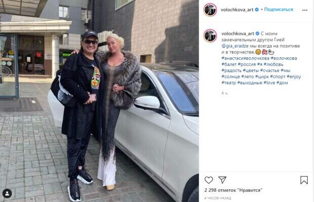 В этот же рас балерина в скромном платье в пол с устаревшим дизайном и принтом показала, как проводит время в компании товарища. Как можно заметить, Анастасия для выхода в свет также надела туфли на высокой шпильке с платформой и нацепила накладные волосы для прически, которая после растрепалась. «С моим замечательным другом Гией @gia_eradze мы всегда на позитиве и в творчестве.