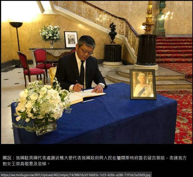 Специальное приглашение оставить запись в книге соболезнований по случаю кончины королевы Великобритании получил представитель Тайваня в Соединенном королевстве, сообщил 18 сентября портал Taiwan News. МИД Тайваня заявил, что представитель острова в Великобритании Келли Сю получила особое приглашение посетить дом Ланкастер в Лондоне и оставить в находящейся там книге соболезнований по случаю кончины королевы Елизаветы II.