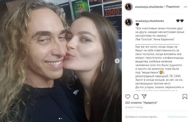 Молодая любовница Тарзана, актриса Анастасия Шульженко удивила очередной выходкой Как сообщает Politeka.net, на своей странице в Инстаграм девушка показала фото, на котором нежно целует Сергея Глушко. Вначале актриса Процитировав известное изречение русского писателя Льва Толстого "Все счастливые семьи похожи друг на друга, каждая несчастливая семья несчастлива по-своему" из его романа "Анна Каренина".
