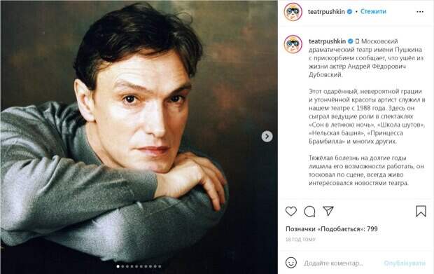 Ушел из жизни известный актер Андрей Дубовский 64-летний артист скончался в Москве, сообщил Московский драматический театр имени Пушкина. Андрей Дубовский окончил ГИТИС в 1980 году, а за год до этого сыграл свою первую роль в кино. Он снимался в таких фильмах, как «Графиня де Монсоро», «Визит к Минотавру», «Страна глухих», «Первая любовь», «Одиссея капитана Блада», «Тайны дворцовых переворотов» и другие.