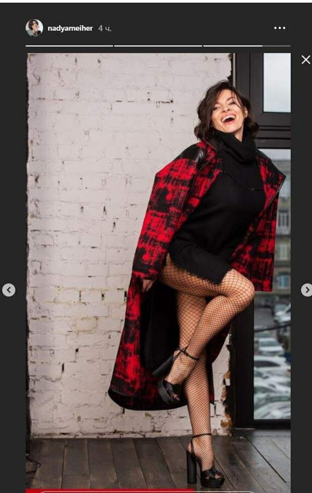 Известная украинская певица Надежда Мейхер показала необычный образ, порадовав поклонников На фото Мейхер позировала в красно-черном пальто и черной кофте. Штанов у красотки не было, только колготы из сеточки. Образ Надя дополнила босоножками на большом каблуке, а сама стояла у кирпичной стены с окном.