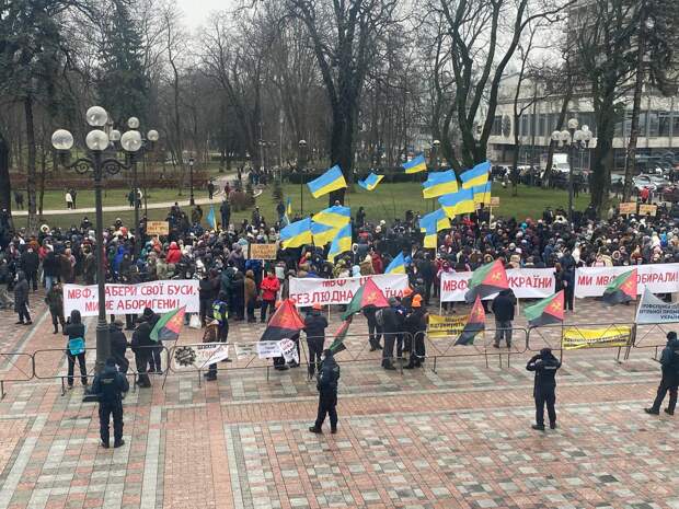 16 декабря сотни митингующих собрались под зданием Верховной Рады на акцию против кредитов МВФ. Журналист Валентин Банных Vesti.ua побывал на месте Участники акции таким образом намерены добиться прекращения губительной практики выпрашивания кабальных кредитов МВФ. Название акции — "Зеленский! Освободи страну от удавки Международного валютного фонда!