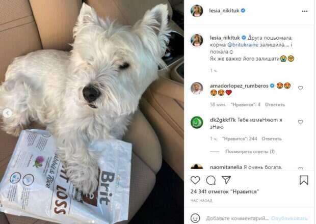 Поскольку Леся часто показывала домашнего любимца Рафика в сети, она даже завела ему страницу в Инстаграм и теперь нередко говорит о нем в своих постах. В этот раз Никитюк эмоционально прощалась с собачкой, так как снова уезжает. «Друга поцеловала, корма оставила и поехала и поехала☺️ Как же трудно его оставлять