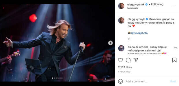 На кадрах Олег Винник в элегантном черном костюме выступает перед огромной публикой на концерте в Николаеве. "Николаев, спасибо за ваше неизменное гостеприимство из года в год", — поблагодарил Олег Винник. Его фанатки, которые сами себя называют "волчицами" оставили артистку множество приятных комментариев: "Спасибо огромное за Вашу любовь и прекрасный концерт! Любим Вас всем сердцем", "Это было нереально круто! Спасибо Вам за прекрасный вечер!", "Концерт был супер! Спасибо Вам и вашей команде за море положительных эмоций!", "Я вас люблю любого", "Олег Анатольевич ведь ти сам знаешь, что я тебе не поклонница и не фанатка. Олег Анатольевич решись серьёзно приехать ко мне. Олег Анатольевич серьезно решись". Ранее сообщалось, Винник повторил фотосессию Каменских на лестнице, появились кадры: "Интересный мужчина" Также, главную музу Олега Винника показали в Сети, вдохновляет на хиты: "Какая прекрасная!" Politeka рассказывала, "Тайная жена" Олега Винника вышла из его тени и добилась желаемого: "Поющее сокровище"