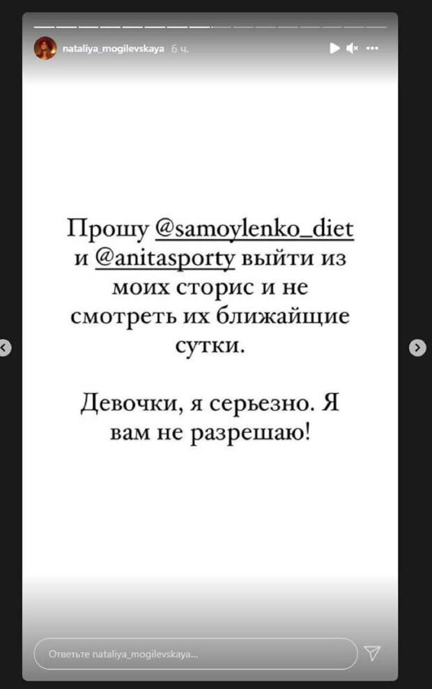 "Прошу Наталью Самойленко и Аниту Луценко выйти из моих сторис и не смотреть ближайшие сутки. Девочки, я серьезно. Я вам не разрешаю", - написала Наталья. "Съем я этот вкусный эклер в конце видео или нет?", - спросила Могилевская. "Вау, самый вкусный эклер на планете. Не знаю как вы, но я сегодня по-моему нарушу свою диету. Вот так мы отпраздновали день открытых дверей в нашей школе", - сказала Наталья. "Это очень вкусно!", - подписала сторис певица. Артистка на видео сьела эклер, улыбаясь и наслаждаясь вкусняшкой. Фанаты не ставили лайки и не писали комментарии, ведь в сторис нет подобных функций. Напомним, Могилевская показала, как они общались с Русланой за кулисами «Співають всі» А еще Politeka сообщала, что Могилевская рассказала, что готовится к важному событию и призналась, на что тратит время Также Politeka писала, что Могилевская подколола Ирину Билык, интервью пришлось срочно прервать