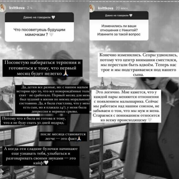 По словам Квитковой, с рождением ребенка их отношения изменились с мужем, и они даже стали ссориться заметно чаще: «Конечно изменились отношения. Ссоры удвоились, потому что центр внимания сместился, мы перестали быть вдвоем. Теперь нас трое и мы подстраиваемся под нашего сына. Это логично, мне кажется у каждой пары меняются отношения с появлением ребенка. Сейчас мы работаем над нашим союзом, не забываем о том, что мы муж и жена. Стараемся с пониманием относиться ко всему происходящему». Также Даша выразилась, что последнее ее путешествие в Париж уже не кажется таким романтичным и беззаботным. «Скажу честно, у нас сейчас сложный период, поэтому нашему трио нужна была смена обстановки. Мы учимся быть родителями, рвем на себе волосы, плачем, забиваемся в угол, получаем нервные срывы, но учимся. Не хочу придумывать идеальную картинку. Для нас эта поездка квест и опыт, который мы хотели. Детки - это тяжело, но это 100% того стоит