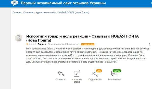 Украинцы жалуются на повреждение посылок при доставке "Новой почтой" Пользователь сети по имени Лариса рассказала о своей проблеме на сайте Otzyvuua. По словам женщины, ее супруг заказал детали с доставкой через "Новую почту", и содержимое одной из посылок прибыло поврежденным. "Блок питания был раздавлен.
