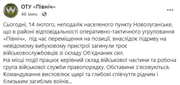 На Донбассе погибли сразу трое защитников Украины Причиной их гибели стало неизвестное взрывное устройство, на котором они подорвались. Это произошло вблизи населенного пункта Новолуганское на Донбассе. О трагедии сообщила пресс-служба оперативно-тактического управления "Північ". В сообщении уточняется, что во время перемещения на позиции, в результате подрыва на неизвестном взрывном устройстве погибли трое военнослужащих из состава Объединенных сил.