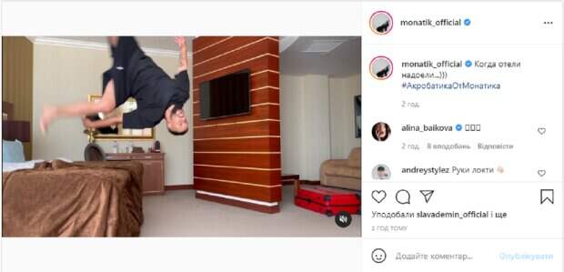 В ролике видно, что Монатик отдыхает в отельном номере, но ему быстро наскучило и он решил развлечься. Артист начал делать сальто – с кровати на пол, прыгать на диван, выглядывать из-за стены и стоять на голове. Ногами кверху. Выглядит все это очень весело и задорно. В подписи к видеоролику Монатик написал: "Когда отели надоели #АкробатикаОтМонатика". Пользователи тут же принялись обсуждать новую публикацию артиста: "Руки локти", "Это те самые упражнения, чтобы спина не болела?", "Моя любимая рубрика. Спорт, юмор и Монатик", "Шок контент. Все с ног на голову стало", "Креативное, весёлое, а главное спортивное утро", "Можно смотреть вечно", "Класс". Напомним, Жена Монатика сверкнула своим нескромным декольте перед Осадчей: "Дима, у вас жена огонь!" Как сообщала Politeka, Подопечная Монатика в вызывающем красном купальнике показала фигуру со всех ракурсов: жаркие кадры. Также Politeka писала, Жена Монатика понежилась в лучах солнца, фото с отдыха: "Такая счастливая и лучезарная".