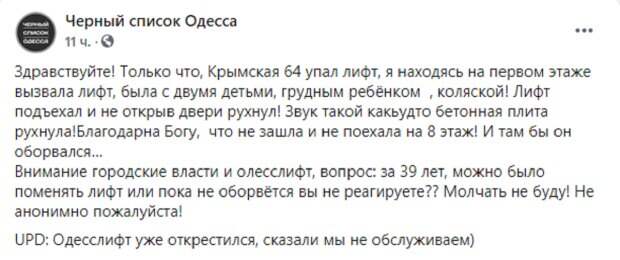 Я, находясь на первом этаже, вызвала лифт, была с двумя детьми, грудным ребенком, коляской! Лифт подъехал и, не открыв дверь, рухнул", – сообщила очевидица ЧП. По словам женщины, звук от падения кабины лифта был такой будто упала бетонная плита. «Благодарна Богу, что не зашла и не поехала на 8 этаж! И там бы он оборвался…», - отметила она. Жильцы многоэтажного дома утвержают, что лифт работал 39 лет и менять его на новый никто не собирался. Одесситы в комментариях выражают слова поддержки женщине. "Вас ангел хранил и деток ваших", "Вас Бог любит и ваших детей! Представляю какой стресс!", "Вы родились в рубашке", "Ужас..Высшие Силы спасли", " Я перестала пользоваться лифтом после того как лежала в травматологии с соседкой по палате, которая стала жертвой такого же обрыва лифта", - пишут в сети. Напомним, что под Одессой вандал разгромил лифт в многоэтажном доме, кадры: Назло соседям Еще Politeka писала, в одесской многоэтажке оборвался лифт, внутри находились люди: кадры ЧП и что известно Также Politeka сообщала, что в Одессе возле Привоза сносят МАФы, пригнали строительную технику: кадры происходящего