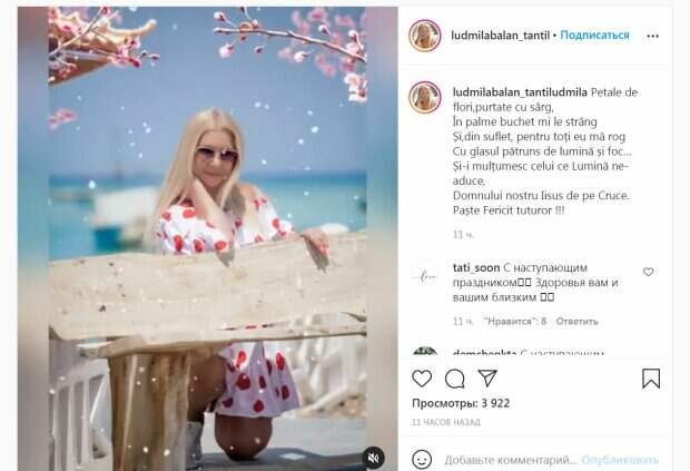 Кроме того, звезда записывает песни, получая позитивные отзывы слушателей. Артистка активно ведет страницы в соцсетях. Сейчас на ее Инстаграм подписаны 32,4 тысячи пользователей сети. В одном из последних постов Людмила поздравила подписчиков с Пасхой (Чтобы посмотреть видео, доскролльте до конца страницы) На кадрах артистку можно заметить в белом стильном мини-платье. Звезда присела на одно колено. Она завершила образ солнечными очками. Кроме того, Балан показала свои паски и писанки. "Лепестки цветов, сильно яркие, Я сжимаю в своем букете И от всего сердца молюсь за всех Голосом, пронизанным светом и огнем ... И я благодарю Свет, который несет нам, Господь наш Иисус на кресте. ХВ!!!", - написала звезда. За 12 часов публикация собрала почти 4000 просмотров и много комментариев. "Здоровья вам и вашим близким