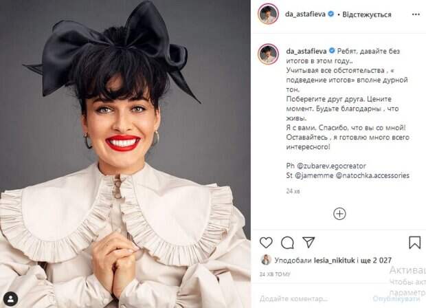 Популярная украинская певица Даша Астафьева впечатлила игривым видом и словами об этом году Как рассказывает Politeka, фотографией знаменитость поделилась у себя в Instagram. «Ребят, давайте без итогов в этом году…Учитывая все обстоятельства, «подведение итогов» вполне дурной тон», - говорится в сообщении.