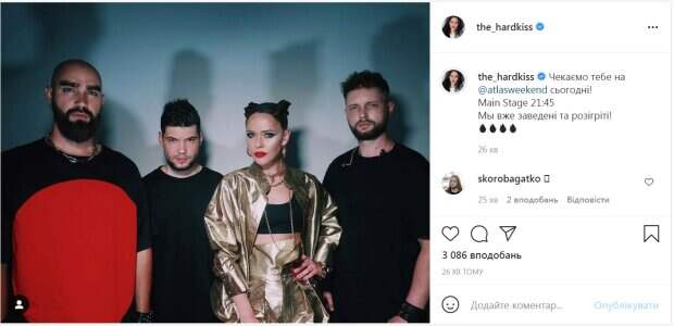 Фронтвумен украинской группы The Hardkiss Юлия Санина порадовала своих поклонников Как сообщает Politeka.net, новый пост артистки в Ин6стаграм вызвал бурную реакцию. Юлия Санина показала фото, на котором запечатлена рядом с музыкантами коллектива, в частности и с креативным продюсером и гитаристом The Hardkiss Валерием Бебко, который является ее супругом.