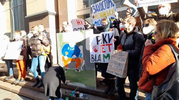 К акции на пару секунд присоединился нардеп "Слуги народа" Николай Тищенко. Он не входит в профильный комитет, но подержал плакат и сказал: "Слава Украине". [video width="1920" height="1080" mp4="https://vesti.ua/wp-content/uploads/2021/03/Fade-Directorial-Blur-Diagonal-1_1.mp4"][/video] Отметим, что сегодня Комитет гуманитарной и информационной политики может поддержать изменения языкового закона и одобрить инициативы депутатов "Слуги народа" Максима Бужанского и Никиты Потураева, которые требуют отменить или отстрочить языковые штрафы.