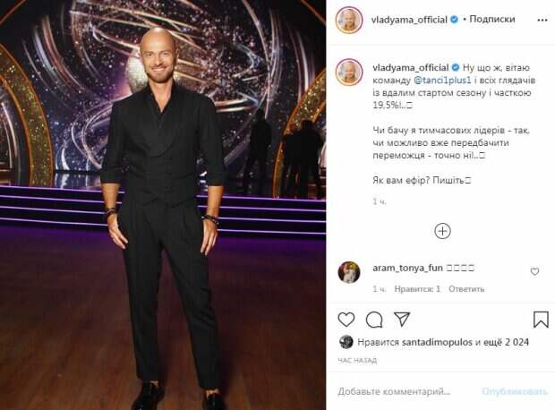 Артист позировал в рубашке, жилетке и длинных брюках со стрелками. Завершили ультрачерный лук туфли в цвет и браслеты на руках. Танцор улыбался и выглядел счастливым. Отметим, Яма предстал на паркете шоу "Танці з зірками", новый сезон которого начался 30 августа. "Ну что ж, поздравляю команду @ tanci1plus1 и всех зрителей с удачным стартом сезона и долей 19,5%! ..