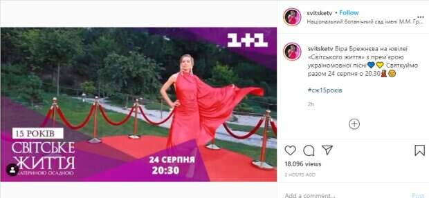 Популярная певица Вера Брежнева, которая уже долгое время живет и выступает в России, выступила с украиноязычной песней Как сообщает Politeka.net, она выступила на юбилее программы "Світське життя" c Екатериной Осадчей. Видео с Верой Брежневой на празднике появилось в социальной сети "Инстаграм". В кадре певица кружится в ярко-красном платье с длинным полупрозрачным рукавом, переходящим в подол.