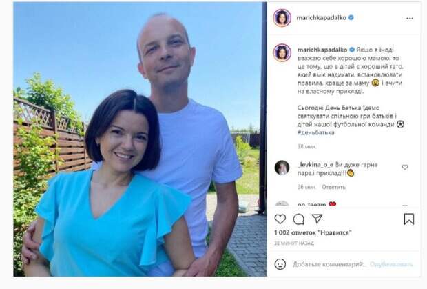 Пара стояла у дома, скрывшись в тени от солнышка. "Если я иногда считаю себя хорошей мамой, то это потому, что у детей есть хороший папа, который умеет вдохновлять, устанавливать правила, лучше мамы и учить на собственном примере. Сегодня День Отца едем праздновать общей игры родителей и детей нашей футбольной команды", - написала Падалко. Фанаты поставили более тысячи лайков и написали комментарии: "Вы очень красивая пара и пример", "Красивая пара и семья", "Вы красивые", "Красивые вместе". Напомним, известная телеведущая Маричка Падалко вышла в прямой эфир без капли грима и здорово удивила украинцев. В этот раз звездная красотка поделилась фотоколлажем, на котором показала, что вышла в прямой эфир выпуска новостей без макияжа. случилось это в рамках эксперимента ко Дню естественной красоты. Напомним, звезда "1+1" Маричка Падалко похвасталась своей победой в Одессе А еще Politeka писала, что звезда "1+1" Маричка Падалко бросила себе вызов в Одессе Также Politeka сообщала, что звезда "1+1" Маричка Падалко сообщила о своем состоянии после вакцинации