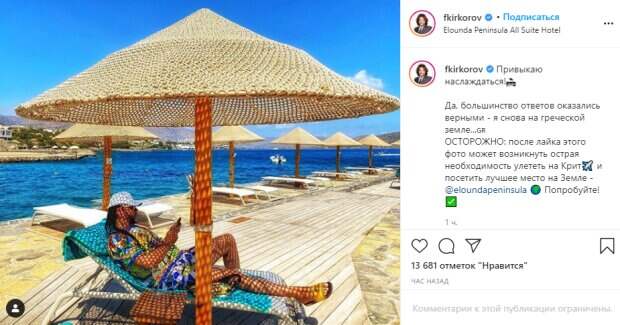 53-летний певец Филипп Киркоров передал привет поклонникам из солнечной Греции, рассказав об одном важном риске Как передает Politeka.net, артист опубликовал свежий снимок в своем микроблоге в Инстаграм, на котором предстал на пустынной набережной. Так, загорающий Филипп обустроился на лежаке под плетеным зонтиком с телефоном в руках.
