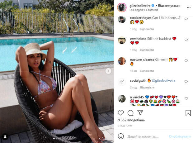 На свежем фото Оливейра предстала в летнем образе. Она надела купальник с цветочками и уселась в кресло возле бассейна. Свой выходной модель решила провести на солнышке. Жизель похвасталась стройными ножками и загорелой манящей кожей. Свое экзотическое лицо красотка прикрыла панамкой. В комментариях девушке оставили массу приятных слов. «Это красиво», «Просто расслабься и сделай селфи», «Великолепная», «это так жарко», «Лето тебе идет», «Такая красивая с потрясающим идеальным телом», «По-прежнему самая красивая», - пишут пользователи сети. Ранее мы писали, что Жизель Оливейра покорила образом в обтягивающих красных штанах с розовым принтом и пиджаке, который она оставила распахнутым. Красотка прикрыла прелести лифчиком, который стал главной изюминкой образа. Напомним, что бразильская красотка из "Victoria’s Secret" перетянула формы кокетливыми завязками ради жарких кадров: "Боже, какая...". А еще Politeka писала, что бразильская модель Victoria’s Secret с бюстом напоказ прогулялась в прозрачной блузе: "Моя любовь". Также Politeka сообщала, что бразильская модель из «Victoria’s Secret» утонула в цветах, вскружив голову нежной красотой: «Конфетка».
