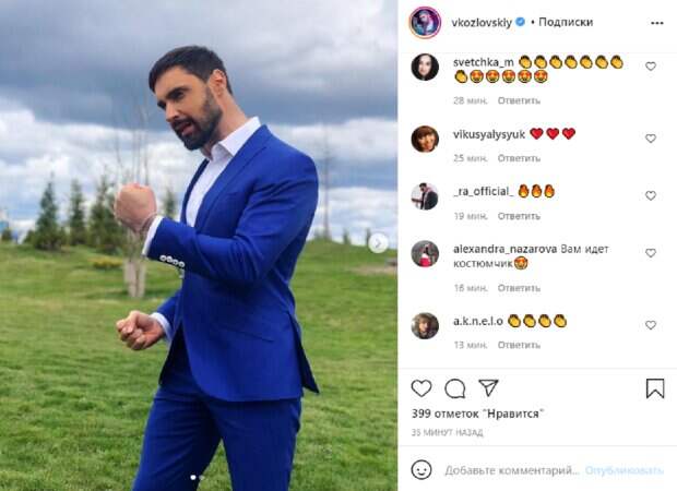 На них Виталий позирует в ярко-синем костюме и белой рубашке, которая выглядывает из пиджака на фоне природного пейзажа – зеленой травы и грозовых туч. На первом снимке знаменитость сжал руки в кулаки, а на втором улыбается, смотря вдаль. В подписи Козловский рассказал, что пасхальное произведение "Христос Воскрес" зазвучит в исполнении звезд украинского шоубизнеса одновременно на 12 языках, а его продюсером выступил Александр Пономарев. Каждый из артистов имел возможность сам выбрать язык, на котором будет исполнять свою часть песнопения, и Виталий выбрал греческий. «Я спел греческой и горжусь тем, что такой эпохальный проект состоялся в нашей стране! Хороших праздников! Христос Воскрес!», - пожелал он всем украинцам. Поклонники не остались равнодушными и принялись восхищаться стильным видом своего любимого певца, отметив, что ему очень идет этот костюмчик и цвет и выглядит он красавчиком. "Вам идет костюмчик