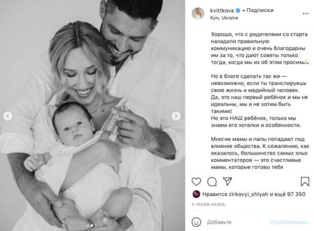 Так, на этот раз Даша Квиткова опубликовала новые фото на своей странице в Инстаграм. На кадрах она, её муж Никита Добрынин обнимают их сына - Льва. Как известно, более 2 месяцев назад девушка родила сына. "Не так держишь ребёнка. Не так одеваешь. Не тем лечишь. Убери кота. Еще не крестила, а уже лицо показываешь?! Не ной, ты не одна рожала. Слишком счастливая, играешь. Спокойная мама - спокойный ребёнок. От чего ты устала, спать она хочет. Путешествовать с таким маленьким ребёнком, да что ты за мать вообще", - перечислила обидные высказывания в свой адрес Даша Квиткова. "Мне регулярно приходят в директ такие сообщения, стоит мне показать Льва или что-то рассказать. Хорошо, что с родителями со старта наладили правильную коммуникацию и очень благодарны им за то, что дают советы только тогда, когда мы их об этом просим