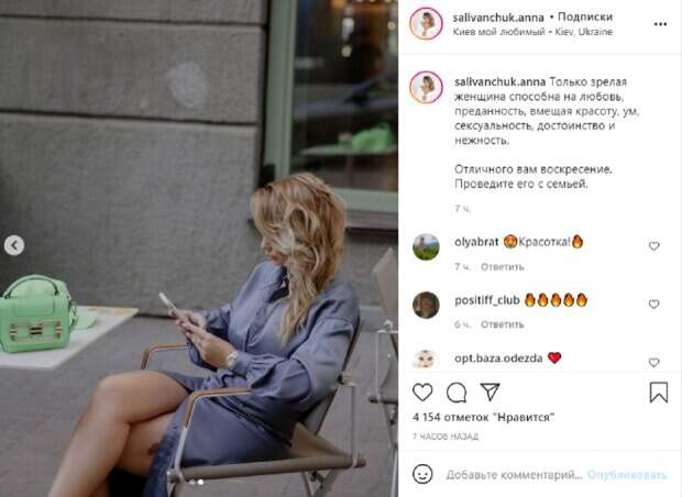 На этот раз у себя в Инстграм Анна поделилась снимками в интересном платье на пуговицах небесно-голубого цвета. Саливанчук кокетливо расстегнула несколько пуговичек сверху, а также забыла застегнуть их снизу, тем самым обнажив стройные ноги. Красотка позировала, сидя за столиком кафе на улице что-то увлеченно рассматривая с телефона. В подписи Анна решила порассуждать о возрасте женщины. «Только зрелая женщина способна на любовь, преданность, вмещая красоту, ум, сексуальность, достоинство и нежность» - убеждена супруга продюсера "Квартал 95". Она пожелала всем отличного выходного, который нужно обязательно провести в кругу семьи. Напомним, что Саливанчук в белой маечке раскрыла свои сильные стороны: "Это еще не все..." Ранее Politeka писала, что жена продюсера "Квартал 95" широко развела ноги перед камерой и дала совет: "Проживите этот день так..." A еще Politeka сообщала, что жена продюсера "Квартал 95" в кружевном комплекте повеселилась в постели: "Я здесь не одна...".