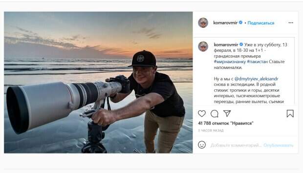 «Мы снова в экспедиции. В родной стихии: тропики и горы, десятки интервью, тысячекилометровые переезды, ранние вылеты, съемки рассветов, нередко сон по 3-5 часов, каждый день эмоции и адреналин. Жизнь на максимальных оборотах. И максимально наизнанку. В общем всё, как я люблю», - рассказал поклонникам Комаров. Он добавил, что по-настоящему хороший результат у дела может получиться только если человек по-настоящему им горит. Ведущий также поделился фото, на котором он запечатлен на берегу моря. При этом, он и сам стоит с камерой с огромным объективом. «Вышел на вечернюю фотовидеоохоту. Обещаю в программах очень интересную и красивую аудио-визуально-информационную "добычу" благодаря этой "пушке"», - объяснил ведущий. Его поклонники тут же отреагировали на публикацию. «Обожаю "Мир на изнанку "! И восхищаюсь Вашей смелостью и отважностью! Вы крутой», «Дима, удачных съёмок, отличного настроения и крутых впечатлений!!! Самое главное - берегите себя!», «Вот это ракурс», - пишут люди. Напомним, что Комаров из "Мир наизнанку" поделился своим счастьем, ведущего не узнать: "Как я и просил...". Как сообщала Politeka, жена Комарова из "Мир наизнанку" в костюме показала фигуру в полный рост: "Красивее, чем ангелы Victoria's Secret". Также Politeka писала, что жена Комарова из "Мира наизнанку" показала мастерство переодевания: "Сегодня снимаю...".