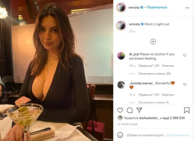 Сама она активно даже в период беременности ходила гулять по городу с домашним питомцем. А свежее фото, на котором Эмили фактически впервые открыто показала себя после рождения сына, повергли фанатов в шок. Черный гольф с длинными рукавами и весьма внушительным вырезом показал пышный бюст модели во всей красе. Похоже, звезда себе не отказывает и в коктейлях. На снимке можно заметить, как Ратаковски держит в руках бокал. Ее подтянутые формы выглядят роскошно, а лицо сияет.Что сразу подметили и поклонники звезды, но были озадачены ее выбором выпивки, ведь она кормит грудью: «Мамина ночь; Пожалуйста, не употребляйте алкоголь, если вы кормите грудью; Замечательно