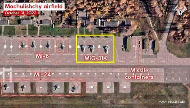 В сети появились спутниковые фотографии, подтверждающие передислокацию с Дальнего Востока России в Беларусь минимум трех тяжелых истребителей-перехватчиков МиГ-31К/И. Боевые самолеты, способные нести гиперзвуковые аэробаллистические ракеты «Кинжал», развернуты аэродроме 50-ой смешанной авиационной базе ВВС Беларуси.