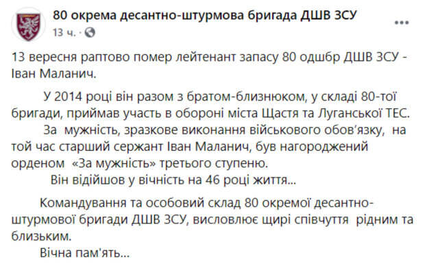 Семь лет назад военный защищал от врага город Счастье на Луганщине Во Львове умер ветеран Антитеррористической операции на Донбассе Иван Маланич. Трагедия произошла 13 сентября. Сердце мужчины остановилось на 46-м году жизни. Об этом сообщили на Facebook-странице 80-й Отдельной десантно-штурмовой бригады Десантно-штурмовой войск ВСУ, лейтенантом запаса которой был погибший.