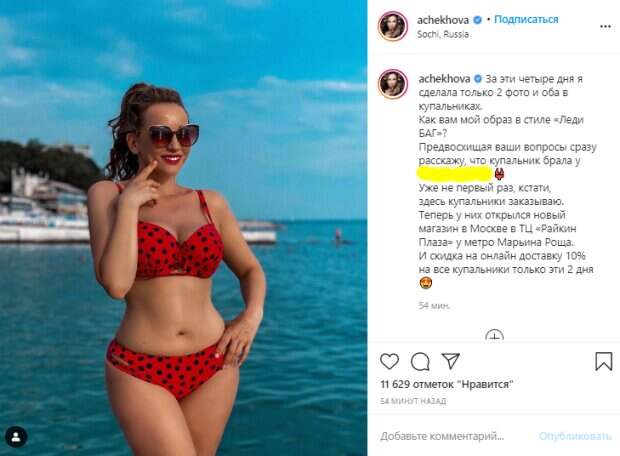 В отличие от оригинала, обладающего особым талисманом удачи для борьбы со злом, у Чеховой несколько другие суперспособности. Телеведущая способна покорить своей сильной харизмой, как мужчин, так и женщин. Чехова, телосложение которой идеально напоминает гитару, пленила нежными изгибами, пышными округлостями и задорной улыбкой. Звезда собрала волосы в хвост и скрыла лицо за солнцезащитными очками, шаловливо дотронувшись пальчиком щеки. "За эти четыре дня я сделала только 2 фото и оба в купальниках. Как вам мой образ в стиле «Леди БАГ»?", - подписала снимок Чехова. Пользователи кинулись комментировать увиденное, не скупясь на комплименты в комментариях. "А Вы Анфиса, в любой одежде замечательны💖" "Шикарные ноги Анфиса" "Анфиса, ваша фигура выше всяких похвал. Восхищаюсь 👍" "А я думаю, что это море разбушевалось🤣" "Аппетит поднимает)))🔥" Чехова в настоящее время отдыхает в Сочи. Одновременно с ней на российском курорте находятся многие звезды, в том числе певец Сергей Лазарев. Ранее мы сообщали, что последний взбудоражил публику предложив им "супчик з самого себя". На фото артист предстал в огромном "котле" (а на самом деле чане с горячей водой). Лазарев решил попробовать арома-баню. Пока Сергей нежился в "котле", Чехова соблазняла отдыхающих в томной позе на лежаке. Напомним, Лазарева в одних плавках засняли с "любовником" на отдыхе, Ани Лорак не у дел: жаркие кадры Также Politeka писала, что Чехова бессовестно сверкнула аппетитным силуэтом в тонкой пижаме А еще Politeka сообщала, что Анфиса Чехова неожиданно показала своего главного мужчину, личные кадры
