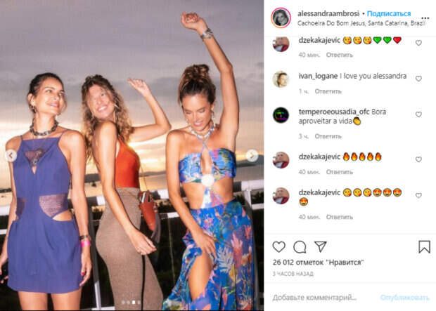 Бразильская модель Алессандра Амбросио, представляющая бренд нижнего белья Victoria’s Secret, порадовала публику яркими кадрами Как передает Politeka.net, 39-летняя звезда опубликовала новые фото в своем микроблоге в Инстаграм, на которых предстала с друзьями. Так, Амбросио в синем платье с безумными вырезами показала, как наслаждается жизнью, несмотря ни на что.