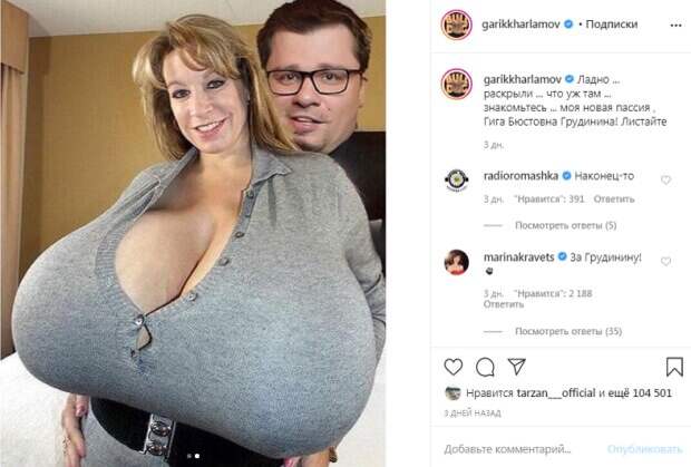 Чтобы опровергнуть все сплетни Харламов решил опубликовать фото с новой девушкой. Он выложил фото, на котором фотошопом приделал к себе женщину с огромной грудью. Таким образом комик высмеял предположение о том, что у него появилась новая любовь. «Ладно... раскрыли... что уж там... знакомьтесь... моя новая пассия, Гига Бюстовна Грудинина!», - подписал фото юморист. Стоит отметить, что поклонники Харламова оценили пост комика. В комментариях ему оставили массу позитивных отзывов. За несколько дней его фото собрало более 100 тысяч лайков. «Вы просто созданы друг для друга!», «Кто-нибудь позвоните пожарным, потому что этот пост огонь», «Да с Тимуром они, че всем не ясно, думают как вернуть Кристину», «Гарик))) ты время даром не терял», «Ходят слухи, что Харламов и Асмус специально развелись, мол это реалити шоу новое», - пишут пользователи сети. Напомним, что Харламов после развода с Асмус коротает одиночество с пышногрудой красоткой: "Знакомьтесь, моя новая...". Как сообщала Politeka, Асмус после расставания с Харламовым огорошила пикантным фото и срочной новостью: "Я буду искать тебя". Также Politeka писала, что Асмус засветила самое дорогое, что у нее осталось после расставания с Харламовым: «Воплощение счастья».