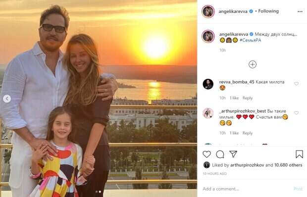 Артист и его супруга постоянно делятся совместными снимками и показывают, как вместе воспитывают детей. На этот раз на странице Анжелики появились два красивых фото, сделанных на закате. На первом они вместе с Александром стоят на балконе, артист обнимает и прижимает жену к себе, вечерний ветер развевает волосы супругов. На заднем плане можно заметит заходящее солнце, которое красиво отражается в воде. На другом кадре к Александру и Анжелике присоденилиась их младшая дочь Амели. Девочка держится за руки родителей и лучезарно улыбается на камеру. "Между двух солнц... 🌞👩🏽🌞 #СемьяРА", - подписала снимки Анжелика. Пользователи социальной сети восхитились семейным счастьем пары в комментариях: "Спокойствия и мира вашему дому❤️"; "Какие красивые ❤️"; "Анжелика, у вас самая красивая семья! Счастья вам 😍 Люююю сильно-сильно) Я так понимаю, что фотограф Алиса? 💖 Ну она огромная молодец ,делает супер-фотки!!!; "Урааааа!!!! Новый пост!!!! 😘 Ждала)) Анжелика, вы с Александром очень красивая пара! Счастье🥰 Самая лучшая семья💗🤗"; "Какая милота😍"; "Какие вы красивые !Загляденье )"; "Бесконечно прекрасные люди ✨✨✨"; "Крутяшки😍 не всем дано!". Напомним, бледная жена Артура Пирожкова поразила видом в бикини, редкое фото: "Такого не было никогда". Как сообщала Politeka, радостный Артур Пирожков похвастался семейной идиллией: "Пирожкова и Пироженка". Также Politeka писала, что похудевшая жена Артура Пирожкова заворожила своими достоинствами.