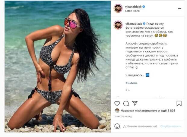 Красотка показала фото, на котором была в бикини и очках, став на коленки и расставив ножки. Девушка выгнулась, демонстрируя роскошные формы. "Глядя на эту фотографию складывается впечатление, что я сгибаюсь, как тростинка на ветру. А насчёт секрета стройности, которым вы меня просите поделиться в каждом втором комментарии в директ и под постом, а иногда даже не просите, а требуете и обвиняете, что я этот секрет прячу от Вас. Я поделюсь", - написала Виктория. Фанаты поставили более 3 тысяч лайков и написали комментарии: "Идеальная просто! Твой секрет в каком-то волшебстве…))))", "Шикарная и любимая Виктория", "Да, хочу тоже знать секрет". Напомним, экс-солистка "НеАнгелов" Смеюха блеснула загорелым торсом на крыльце своей виллы А еще Politeka писала, что Каминская и Смеюха из "НеАнгелов" подверглись насмешкам, показав свою "дружбу" Также Politeka сообщала, что экс-солистка "НеАнгелов" Смеюха заинтриговала фигуркой в странном наряде