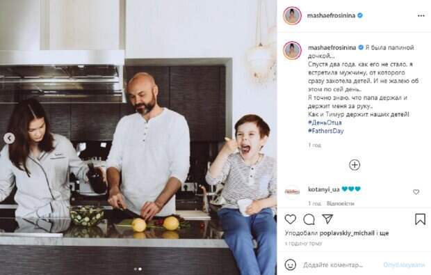 А в этот раз она выложила кадры из личного архива, на которых показала своего отца и отца своих детей. На архивном кадре можно увидеть, как будущая телезвезда Мария выглядела в юности. На снимке ее папа держит на руках младшую сестру теледивы Лизу, а сама Маша стоит рядом и явно чем-то увлечена, ведь не смотрит в камеру. Здесь у нее короткая стрижка и простой наряд – именно так в юности выглядела будущая телезвезда. На втором снимке Ефросинина показала своего мужа Тимура Хромаева, который запечатлен на кухне вместе с их детьми – Наной и Сашей. В подписи к публикации Маша написала: "Я была папиной дочкой… Спустя два года, как его не стало, я встретила мужчину, от которого сразу захотела детей. И не жалею об этом по сей день. Я точно знаю, что папа держал и держит меня за руку. Как и Тимур держит наших детей!". Пользователи тут же начали активно обсуждать новые фото на странице телеведущей, отмечая, что ее муж очень похож на отца. Напомним, Ефросинина заворожила кадрами переодевания на фоне постели: "На Машу можно смотреть вечно" Как сообщала Politeka, 42-летняя Ефросинина на пляже хвастнула подтянутой фигурой в купальнике: "Ты светишься". Также Politeka писала, Ефросинина похвасталась своим роскошным жилищем в Мексике: "Скринить можно и фотообои делать".