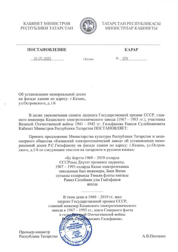В Казани появится мемориальная доска в честь лауреата Государственной премии СССР, главного инженера Казанского электротехнического завода (1967-1993 гг.), участника Великой Отечественной войны Равиля Гильфанова. Соответствующее постановление подписал премьер-министр Татарстана Алексей Песошин. Увековечь память Гильфанова планируют на фасаде здания по улице Островского, 1/6.